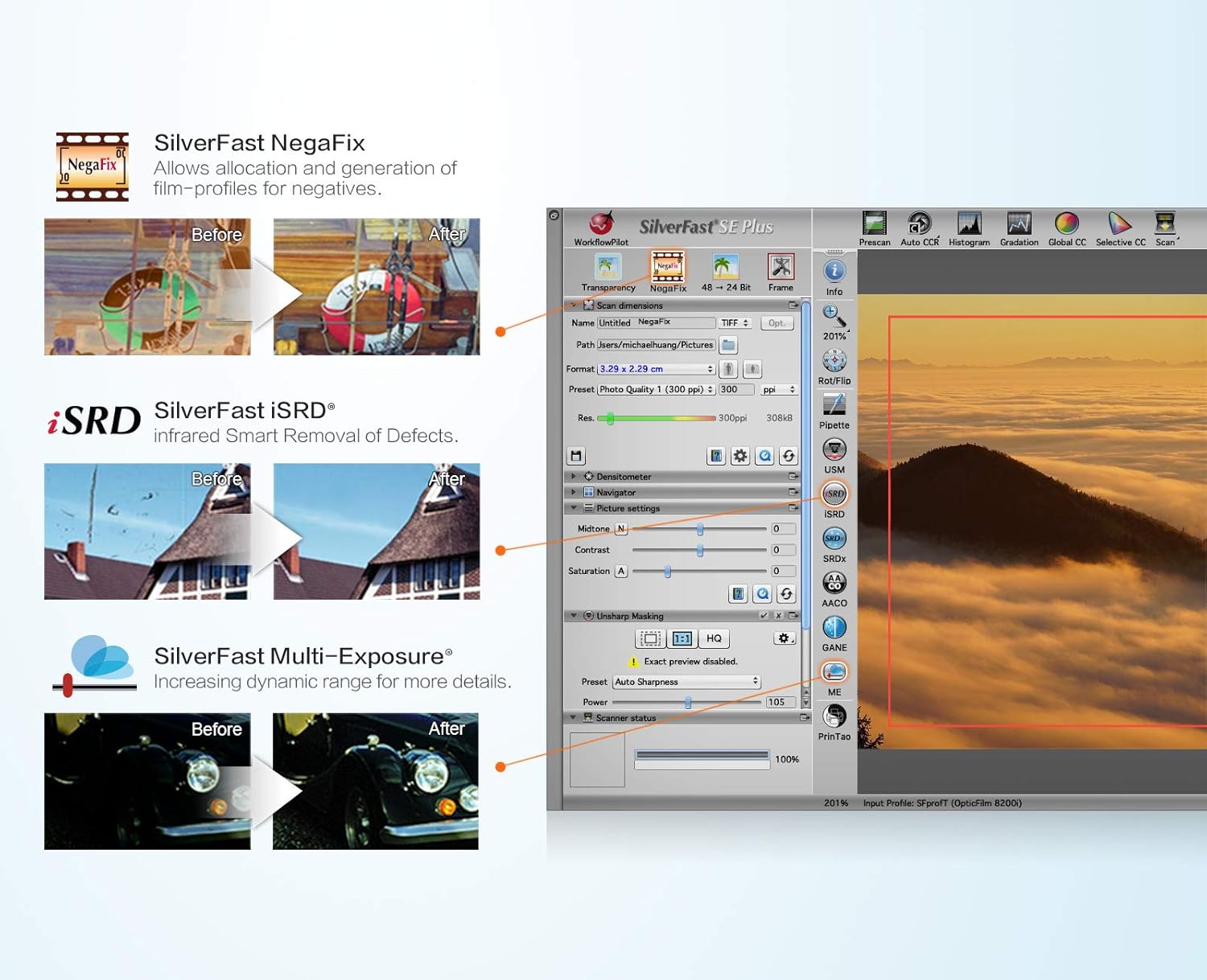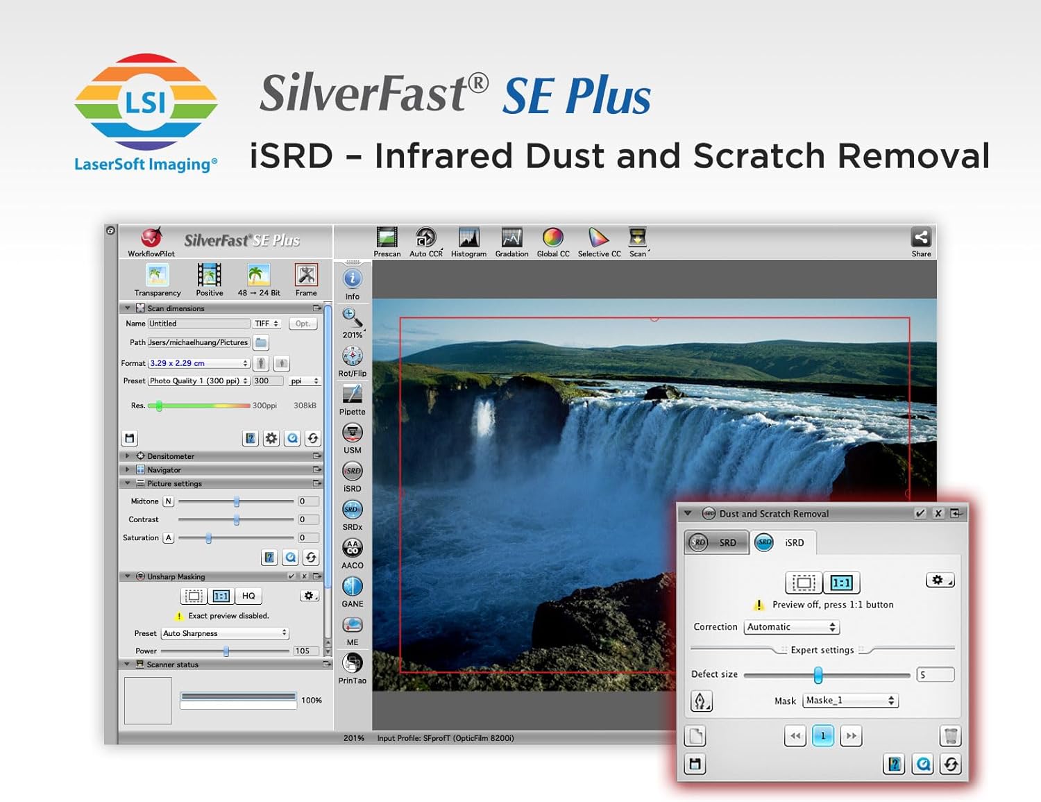 - Built-in infrared channel can detect dust and scratches on the surface of the original negatives and slides. It is highly useful for defect removal without retouching the images.