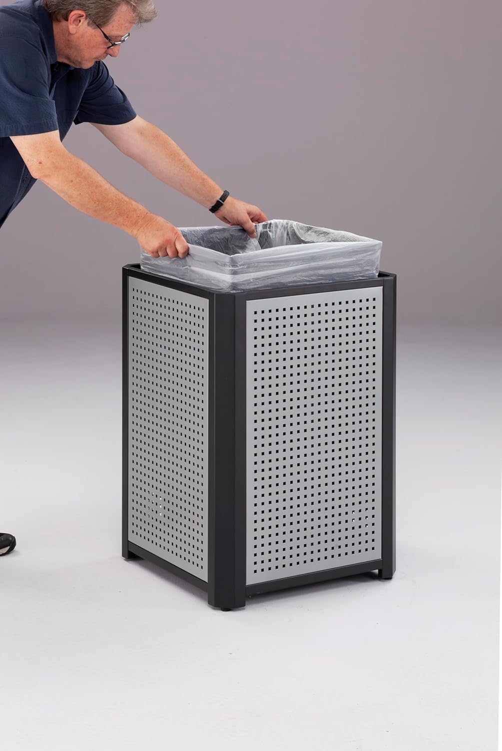 - MODERN STYLING. Evos Outdoor and Indoor Steel Trash Can features four stylish perforated panels on a heavy-duty steel frame with galvanized base to resist rust and corrosion while keeping high traffic areas clean and litter free.