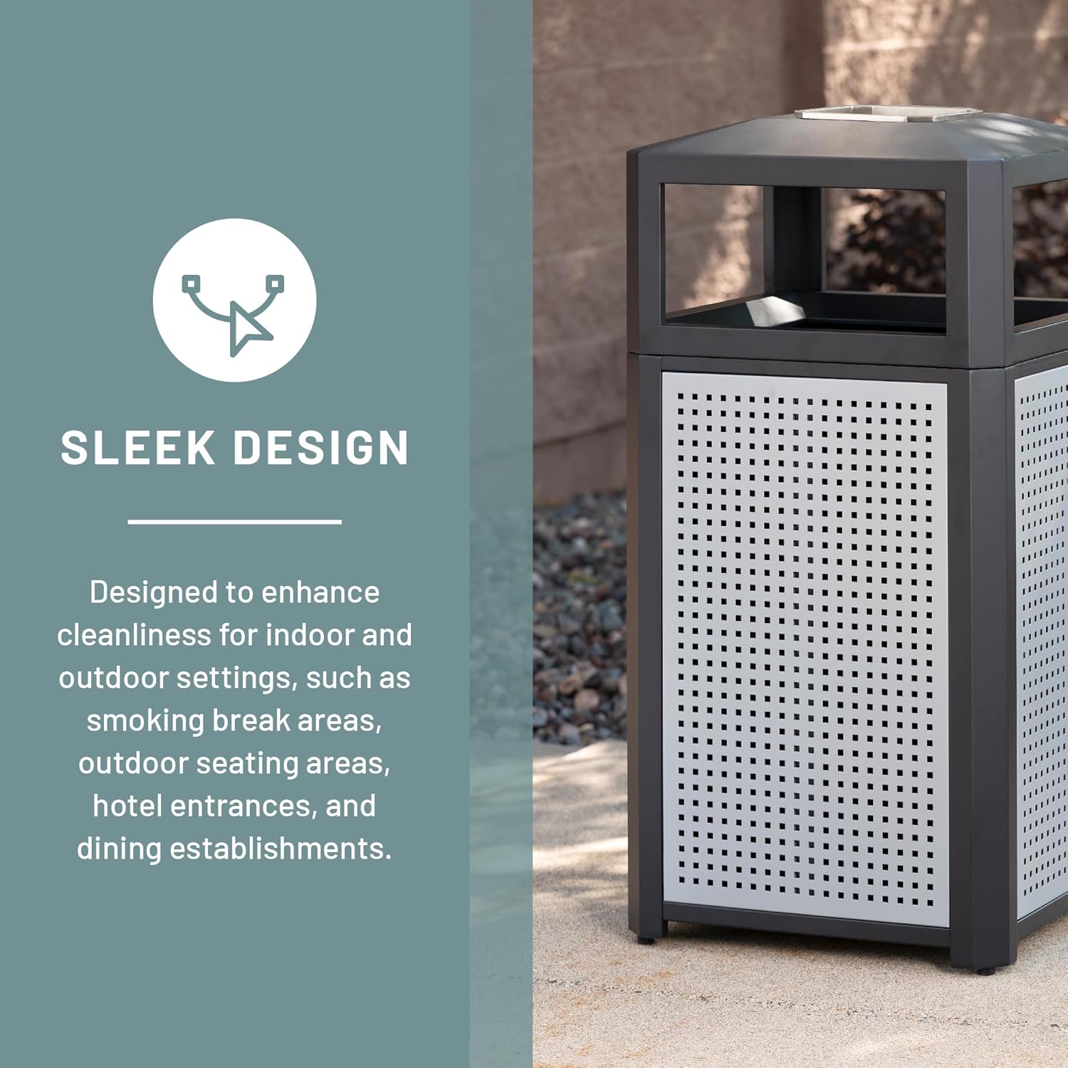 - MODERN STYLING. Evos Outdoor and Indoor Steel Trash Can with Ash Urn features four stylish perforated panels, four convenient openings and a built-in stainless steel ashtray that enhances high traffic areas while keeping them clean and litter free.