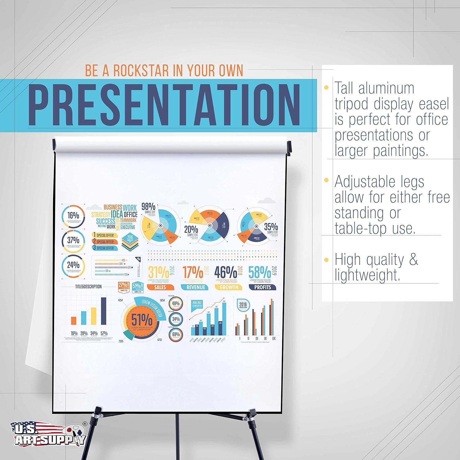 - A heavy duty display flipchart easel to present information at an optimal height. For writing pads, office and classroom presentations, anchor chart stands, trade shows, posters, dry erase boards, event and store signs.