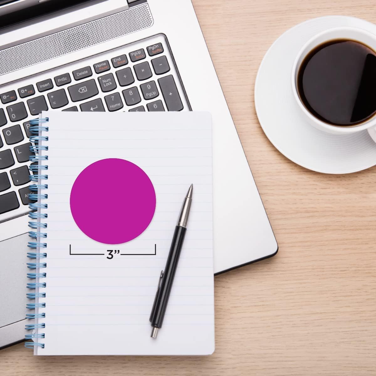- Contents of Adhesive Dots Package: Receive 500 fluorescent purple 3-inch colored circle stickers neatly wound on a 3-inch diameter core, shrink-wrapped for protection