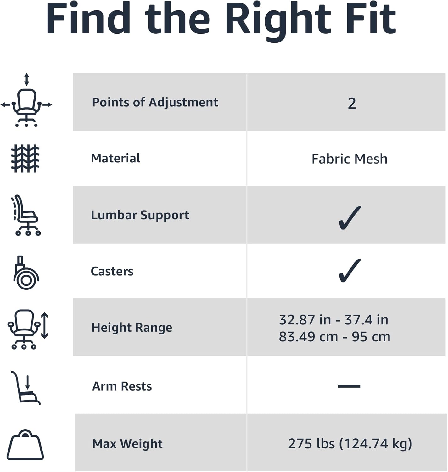 Amazon Basics Rolling Desk Chair, Adjustable, Low Back, Padded Seat, Breathable Mesh, Swivel, Black, 21.25" D x 22.5" W x 38" H