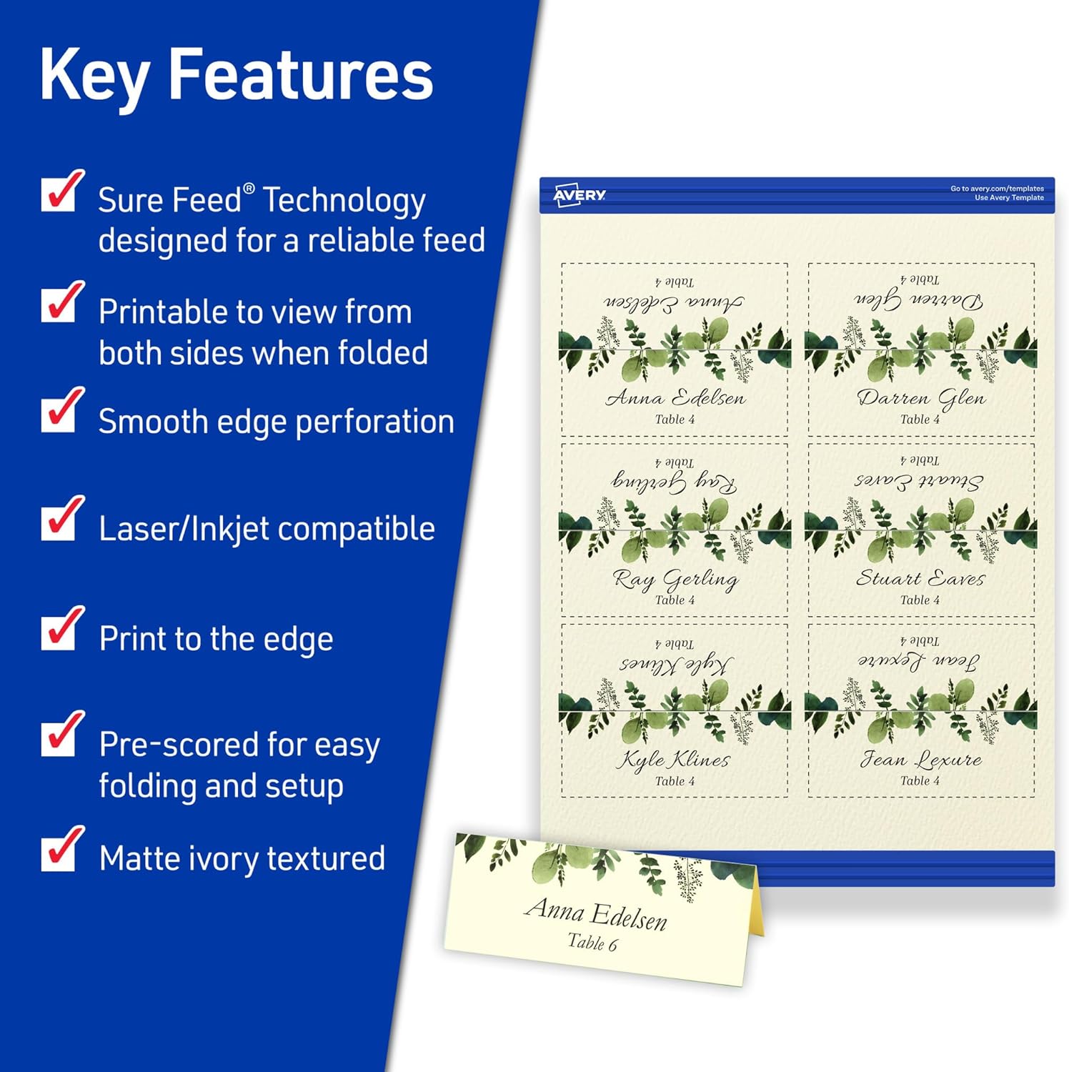 Avery Printable Place Cards with Sure Feed Technology, 1-7/16" x 3-3/4", Textured Ivory, 150 Blank Tent Cards for Laser or Inkjet Printers (5012)