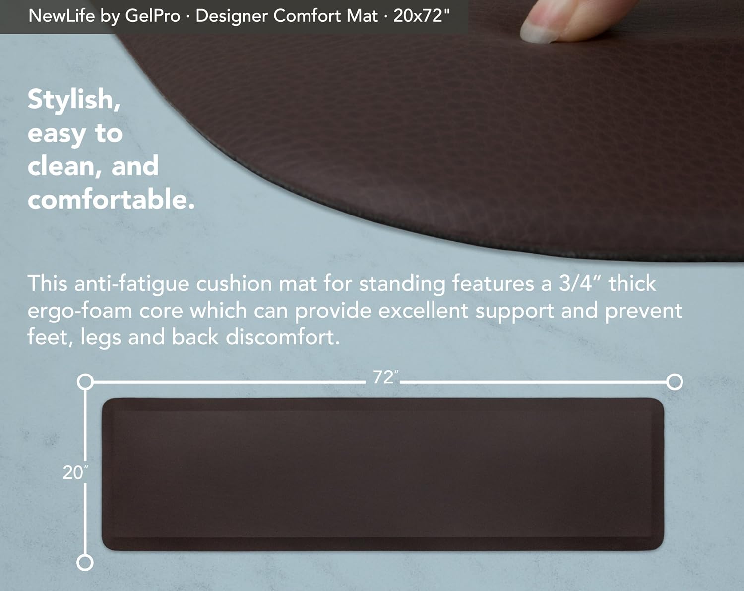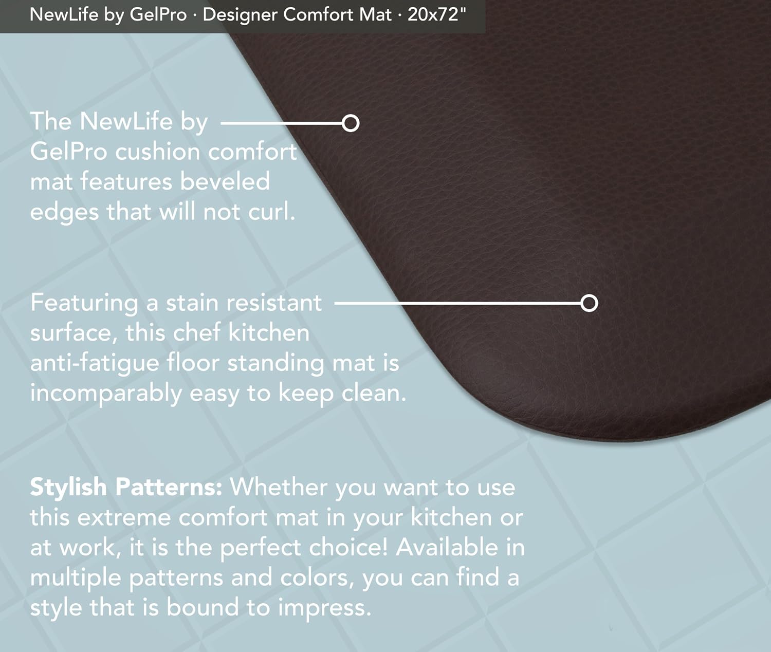 - BEVELLED EDGES AND DURABLE CONSTRUCTION: The NewLife by GelPro cushion comfort mat features beveled edges that will not curl, protecting you from tripping over it.