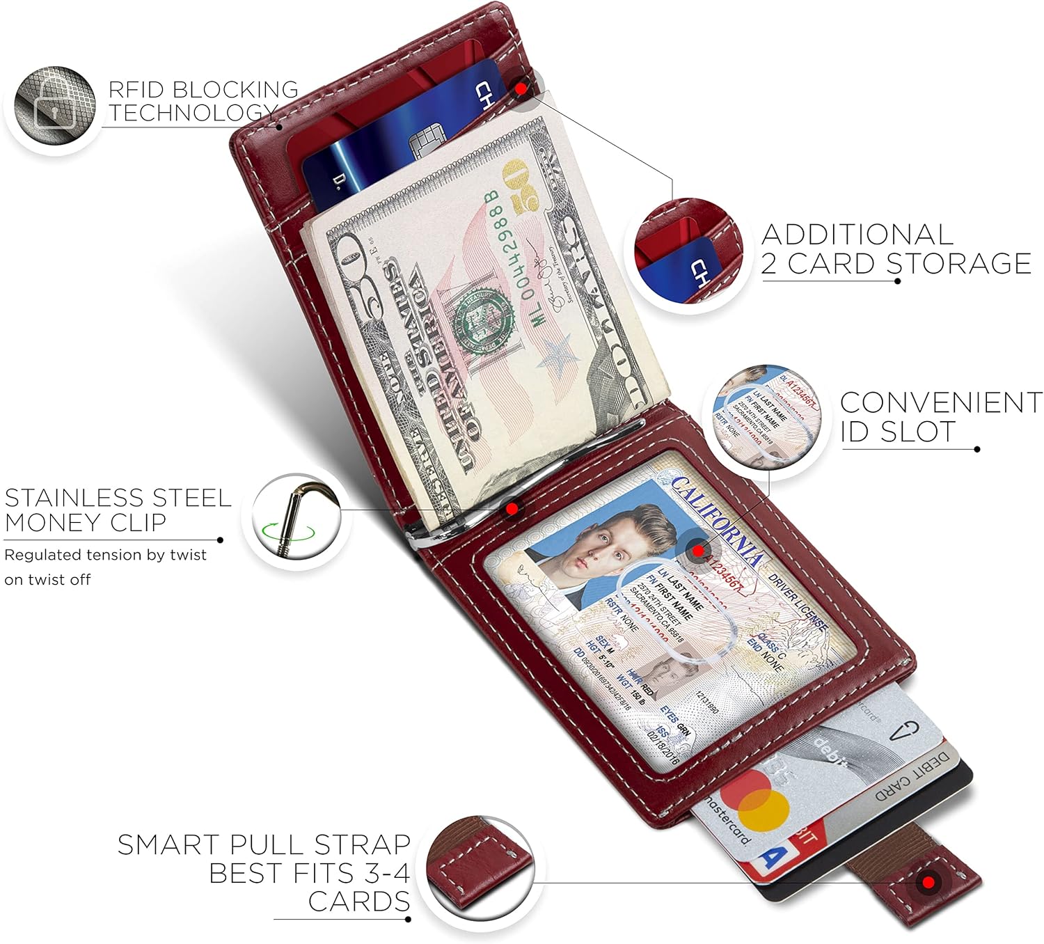- SLIM AND STYLISH - Made with the Finest Full Grain leather, Top Grain Leather and Vegan Leather. Designed Quick Access ID Windows, Best Fits 6-8 cards plus US bills with no bulk, and a minimal Pull-tab design to reduce bulk - Wallet Size: 3.9" in. x 2.85" in. 0.5" in.