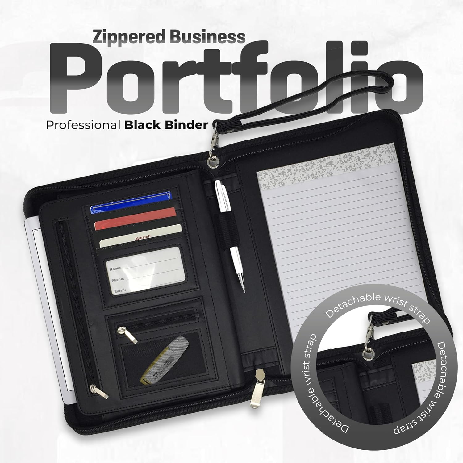 Zippered Leather Portfolio Binder with Junior Legal 5x8 Notepad - Black PU Leather Business Padfolio Organizer Folder with 8 Inch Tablet Sleeve & Gift Box by Lautus Designs