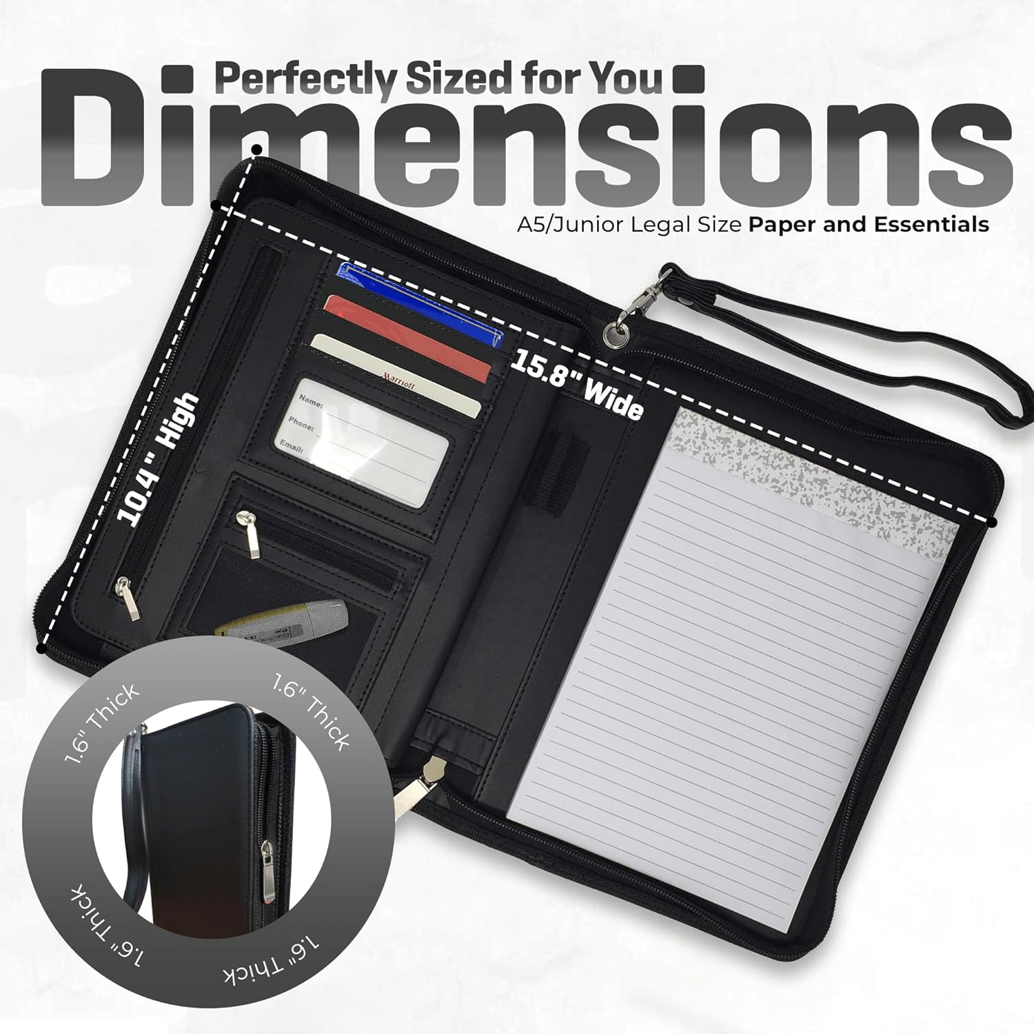 - COMPACT - Bring your essentials with you in this leather portfolio folder including your 8 inch tablet (e.g. iPad Mini) plus Junior Legal (5x8"), A5 notepad, 6" x 9" Steno-Pad - or any notebook up to 6.5x9.5" (e.g. Rocketbook Wave Executive) even though the padfolio is over 35% smaller than standard US Letter-sized portfolios.