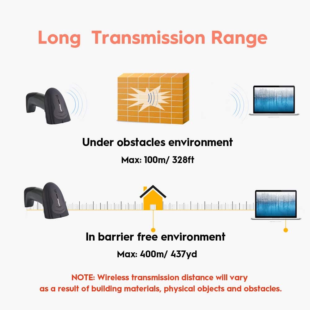 - Using Wireless Transmission Technology.Delivers up to 400 meter/0.25 mile in open area, up to 100 meter/ 328 feet indoor.No Data Cable Needed, freely transmit the barcode to your computer,PC etc.