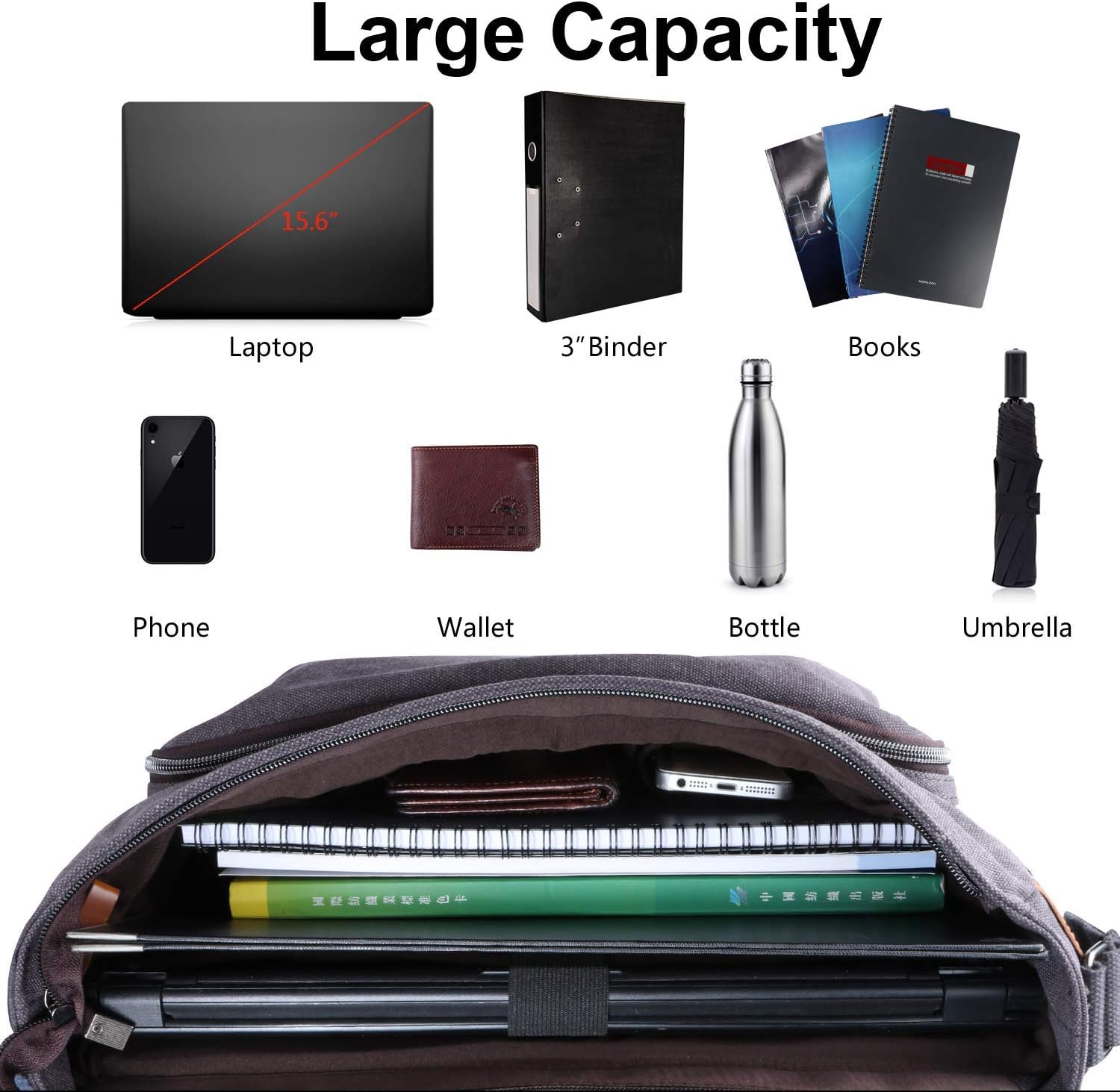 - LARGE MAIN COMPARTMENT: With zip closure, it could fit documents, 3 inch binder etc. Separated padded laptop compartment fit for up to 15‘’-15.6’’ Laptop / Notebook. Not fit for larger computer. Messenger bag Max Dimensions: 17.72 x 13.38 x 5.12 inch.Please measure your laptop before order.