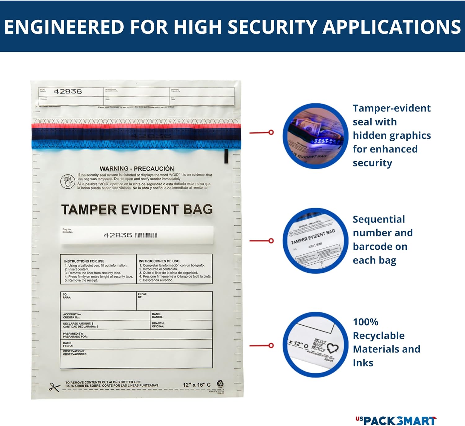 - SUSTAINABLE CHOICE: Our Deposit Bags with Security Tape Tamper Evident are an eco-friendly option, made from 100% recyclable LDPE. We take pride in providing labeling in both English and Spanish, showcasing our dedication to serving the Hispanic community, which holds significant importance to us.