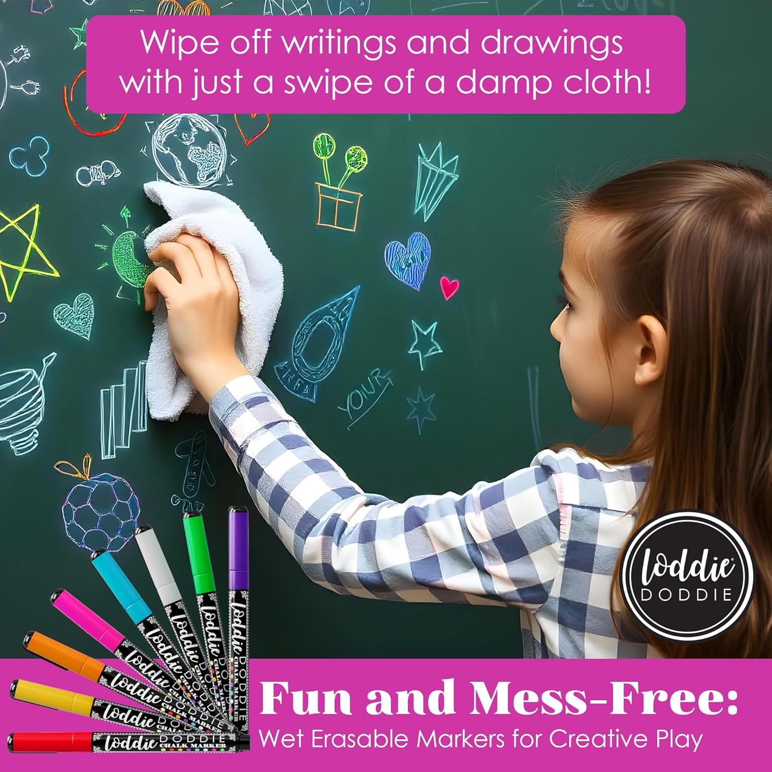 Loddie Doddie Fine Tip Liquid Chalk Markers - Pack of 8 1mm Neon Colors - Erasable Low-Odor Dry Erase Chalk Markers for Chalkboard, Blackboard & Glass