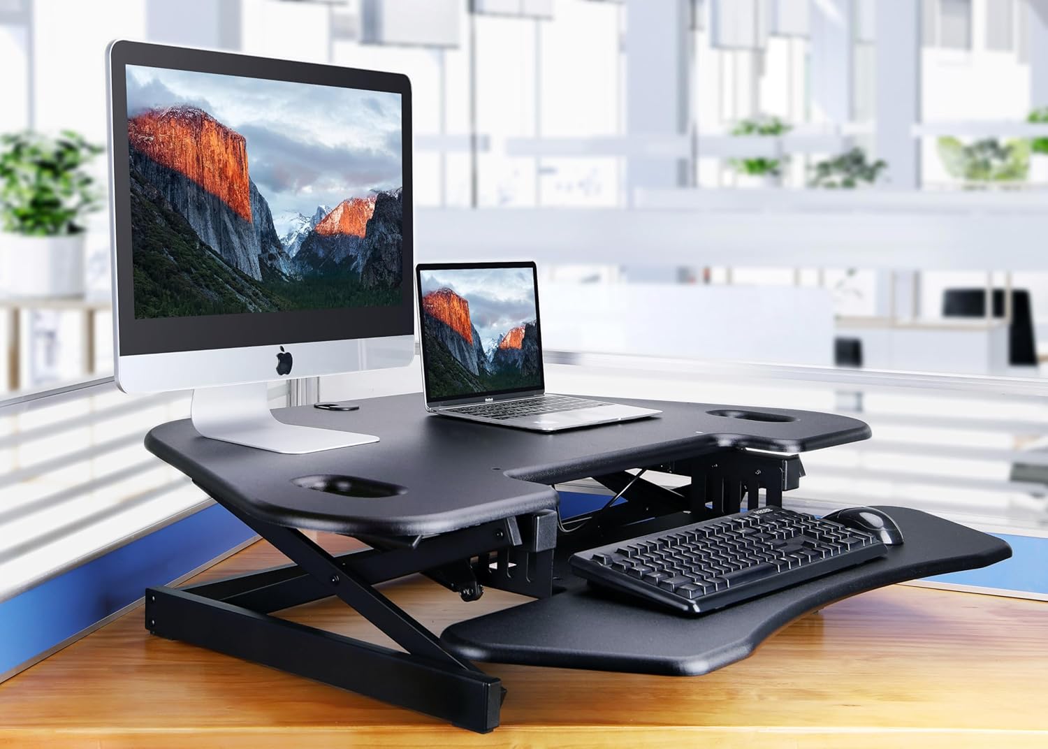 Rocelco 46" Height Adjustable Corner Standing Desk Converter - Quick Sit Stand Up Dual Monitor Riser - Gas Spring Assist Tabletop Computer Workstation - Large Keyboard Tray - Black (R CADRB-46)