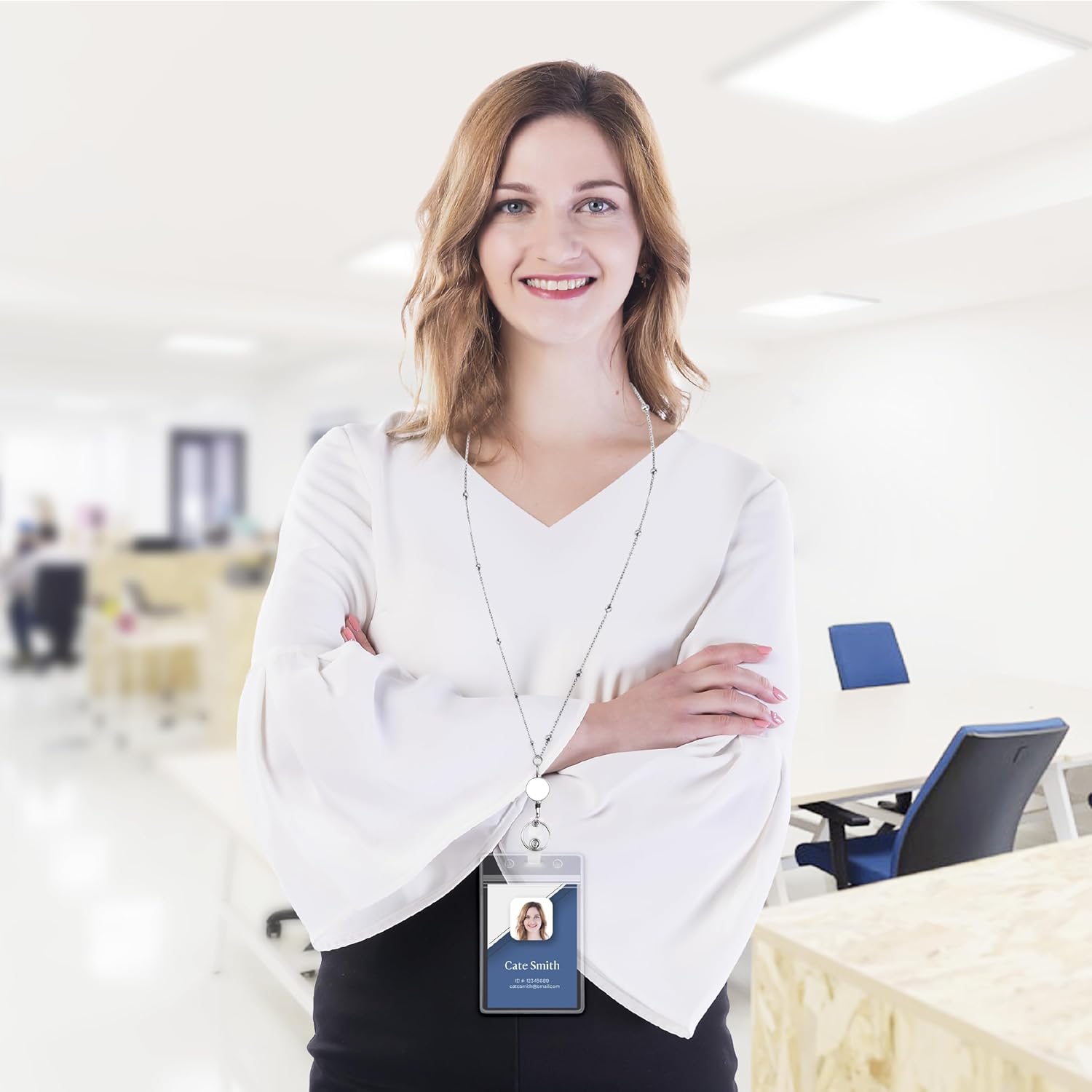 - Fashion Badge Lanyard set: Premium stainless steel beaded lanyard necklace with retractable badge reel pendant makes this retractable badge holder style and elegant. Comes with clear ID card holder so you don't need to buy it elsewhere.
