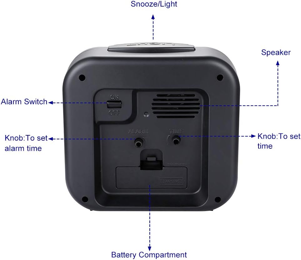 - Large Size-- Size: 5.5" x 5.5" x 2.2",runs on 1 "AA" Battery (not included). Alarm clock stands up at an angle, high quality plastic, square face with white dial, black Arabic numerals, good decoration for tabletop, desk & shelf, bedrooms. Also large size screen and clear bold digits to display time, perfect alarm clock for elderly.