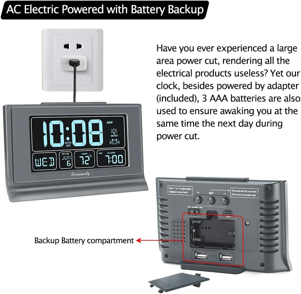 DreamSky Digital Alarm Clock with Battery Backup, 5 Inch Large Display, Auto Set Clock, USB Charging Ports, 12/24H