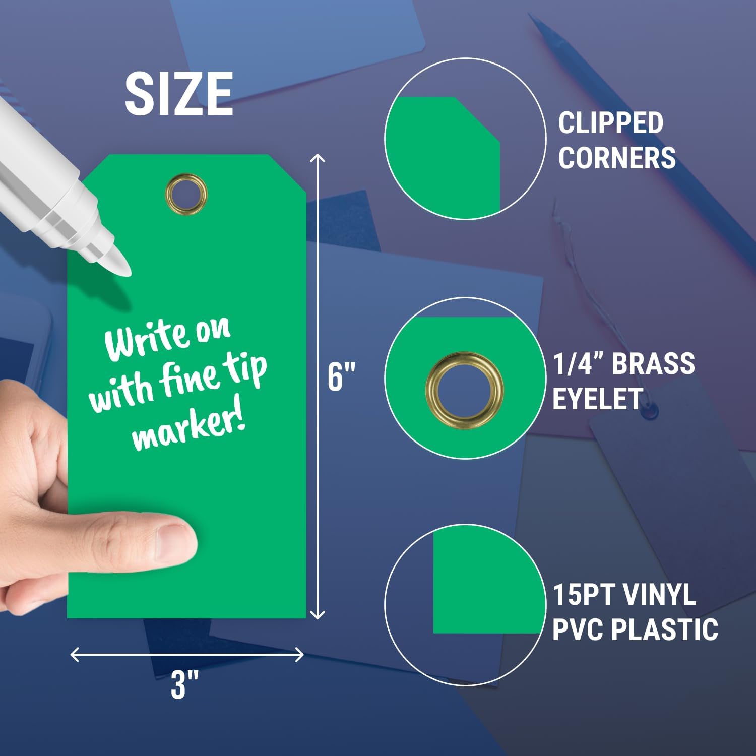- HEAVY DUTY WATERPROOF TAGS: These vinyl tags are made with 15 pt. heavy duty vinyl that is durable, tear-proof, oil-proof, and weatherproof. This ensures that your tags will last longer than any others.