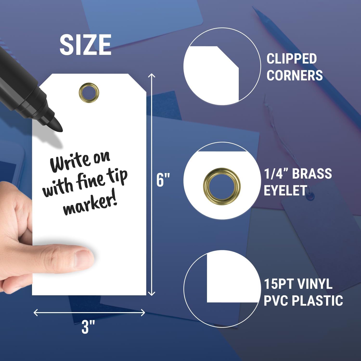 - HEAVY DUTY WATERPROOF TAGS: These vinyl tags are made with 15 pt. heavy duty vinyl that is durable, tear-proof, oil-proof, and weatherproof. This ensures that your tags will last longer than any others.