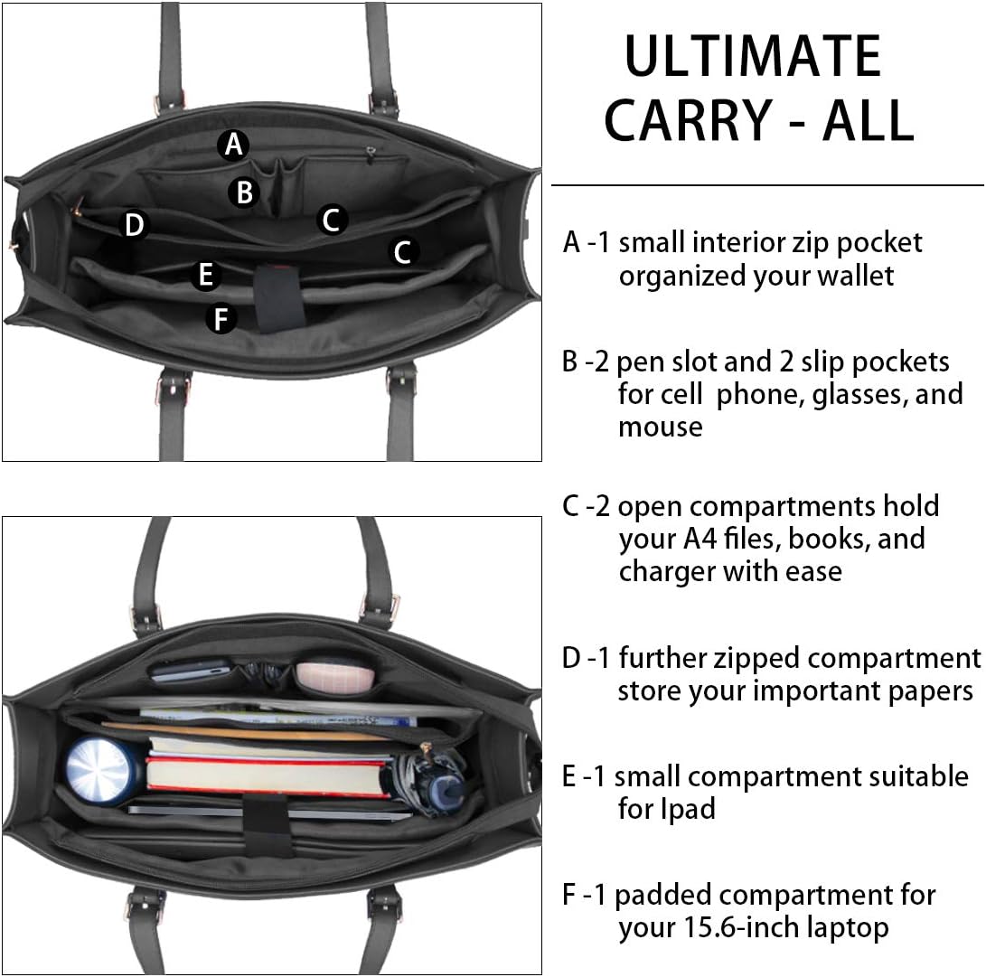 - Roomy Compartment Computer Bag for Women:Laptop bag divided into three sections.One main padded pocket design for 15.6 inch(included 13/14 inch) laptop with a thick padded foam section, two open big pockets perfect for your A4 documents and books, one large zipped pocket for your personal stuff, one iPad pocket, two slot pockets, and two pens pocket, and one small zipper pocket for your files, a wallet, sunglasses, a phone, makeups and so on.