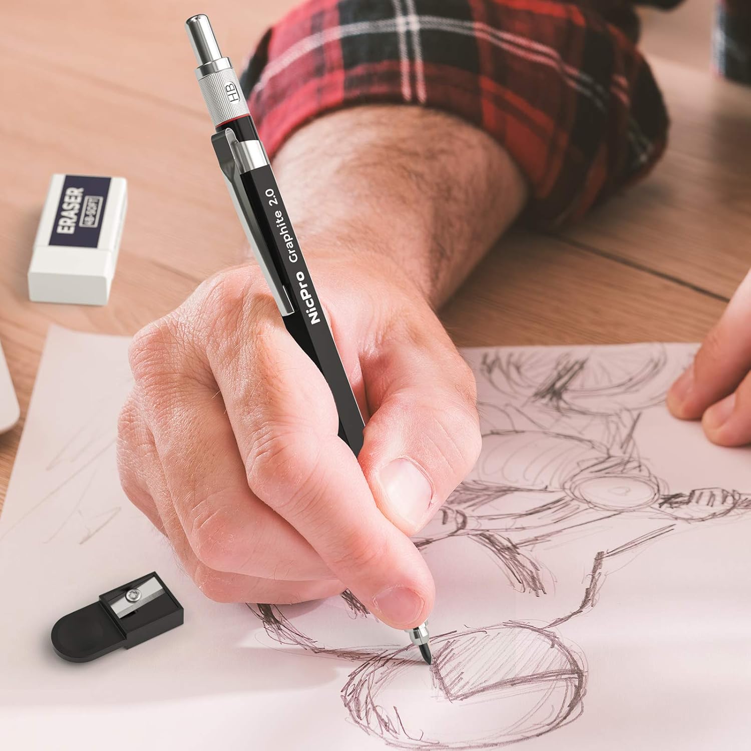 Nicpro 2mm Metal Mechanical Pencil Set, 2PCS Lead Holder 2.0 mm Marker Artist Carpenter Pencils with 120 Graphite Lead Refill (HB 2H 4H 2B 4B & Color), 2 Eraser for Drafting, Drawing Writing Sketching