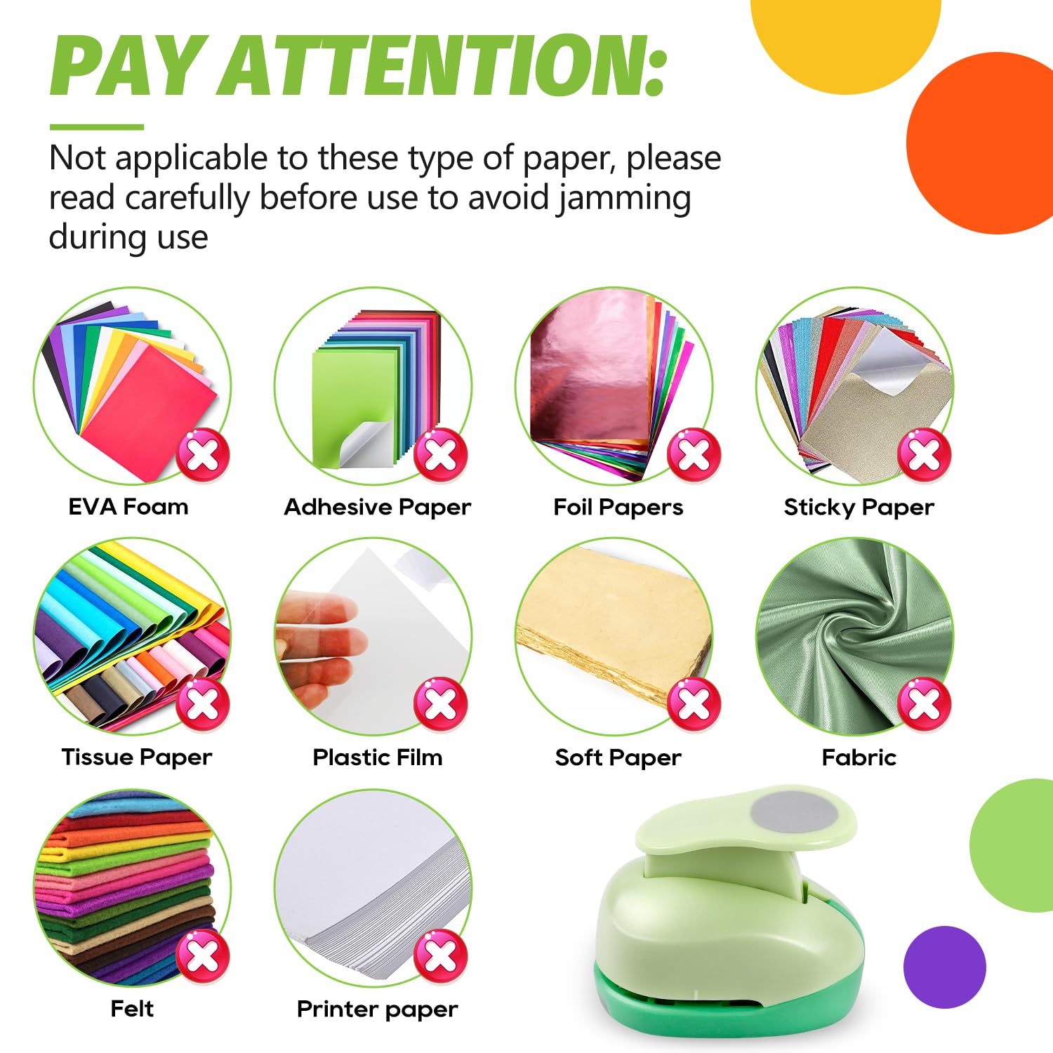 - NO-JAM PAPER GUIDE – Please Use 120–250 g/m² card stock with the craft puncher. Do NOT punch sticker paper, adhesive vinyl, felt, foam, tissue/soft/thin printer paper unless you stack 2–3 layers, wrong paper can jam the punch