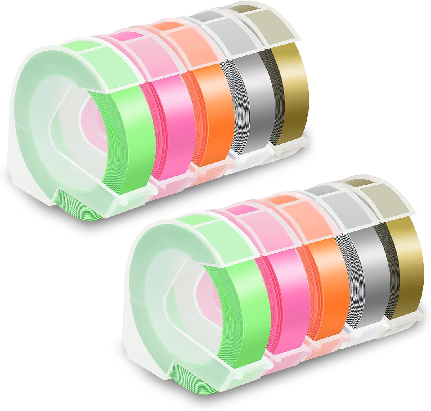 Pristar Compatible for DYMO Embossing 3D Plastic Label Tapes 9mm, Work with DYMO Junior Home Embossing Label Maker, Organizer Xpress Pro, Neon Pink/Orange/Green/Gold/Silver, 3/8" x 9.8', 10-Pack