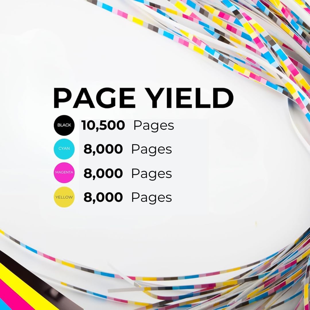 - ššššš šššš šššš ššššš: Black prints up to 10,500 pages; Color (Cyan, Magenta, Yellow) up to 8,000 pages each at 5% coverage. Actual yield may vary.