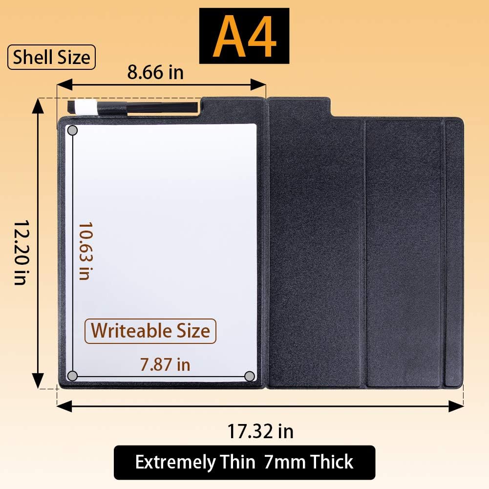 - 💎【PORTABLE AND MOBILE】 PU cover, overall size is about 9"*12", the inner whiteboard is A4 size. The whole thickness is only 0.28", excellent space saving product, you can put it in your file box or easily bring it everywhere.
