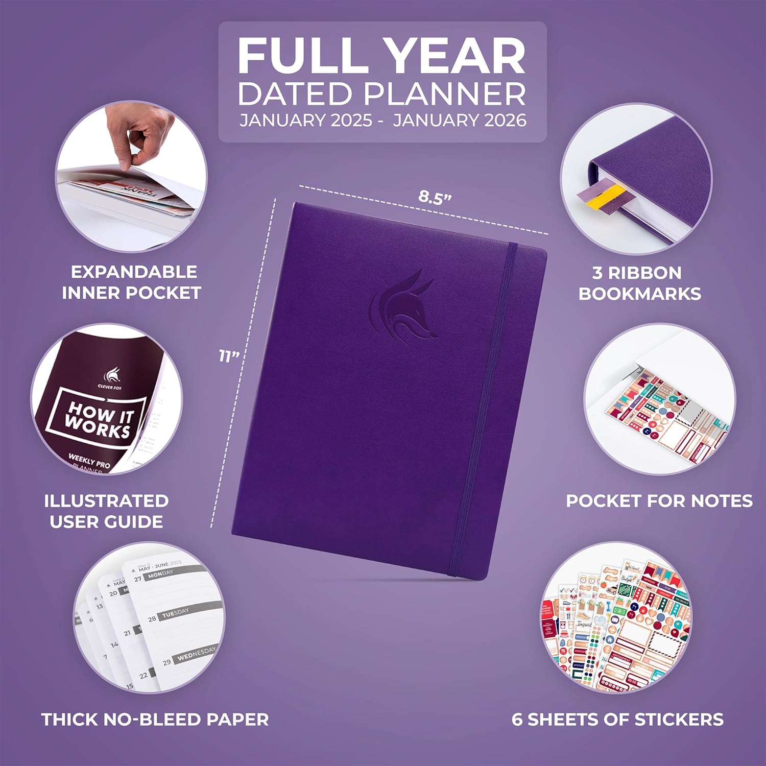Clever Fox Planner PRO Dated (Jan 2025–Jan 2026) Weekly & Monthly Life Planner to Increase Productivity, Time Management and Hit Your Goals – Organizer, Gratitude Journal – A4 Size (Purple)
