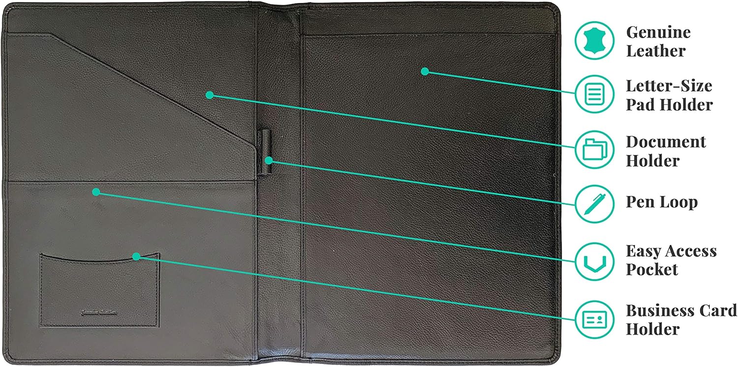 - FEATURES: Letter-Size writing pad (included), Business Card Holder, Resume/Document Holder, Pen Loop and Easy Access Pocket