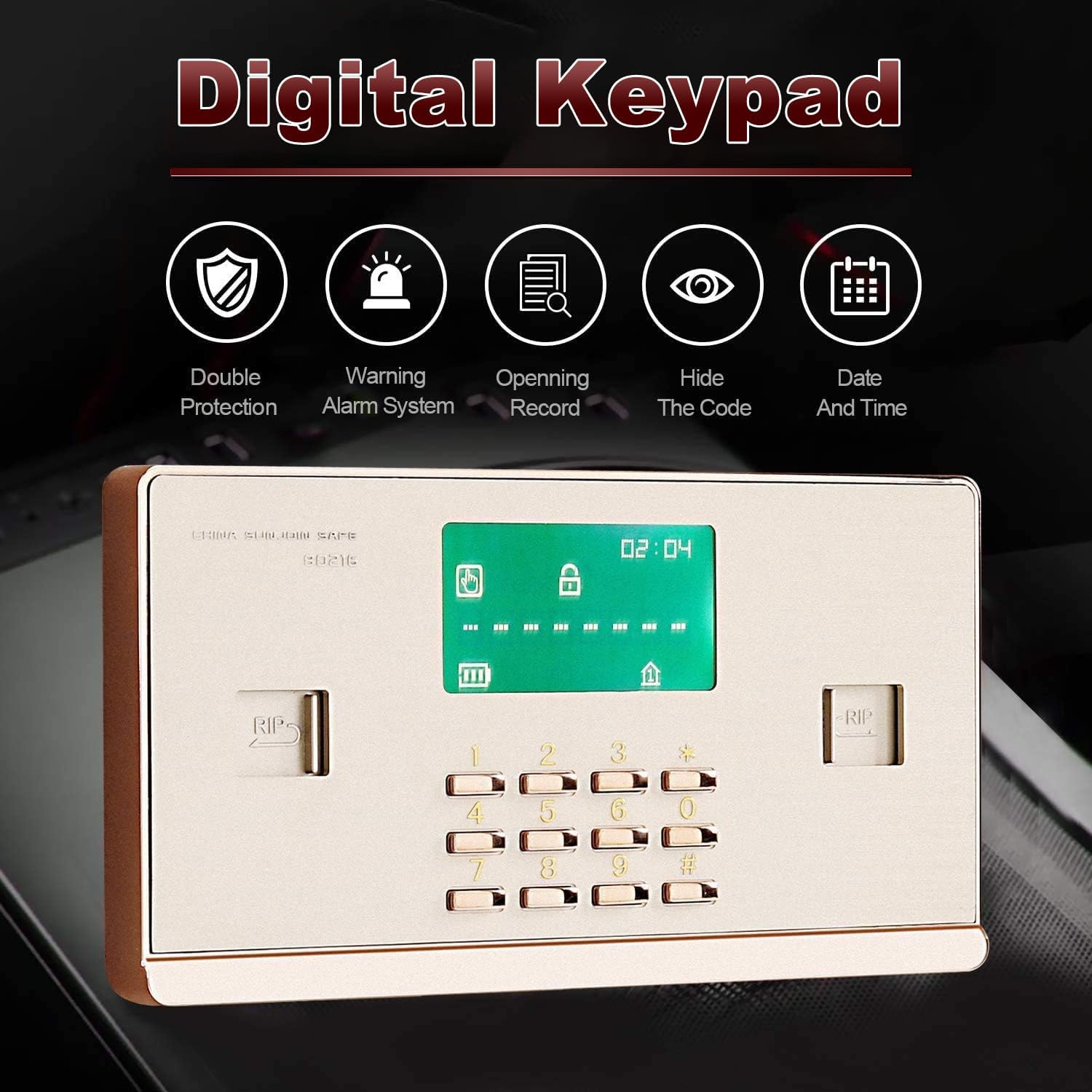 - ✅【SMART WARNING SYSTEM】: Security Safe can keep max 35 opening records, and allows you to program your own code with 1-8 digits; Dial “*” before enter the code can active the secure display feature (the code you enter into will not been shown on the screen), Violent vibration or Three- incorrect entries can activate the alarm system by sounding for 60 seconds.