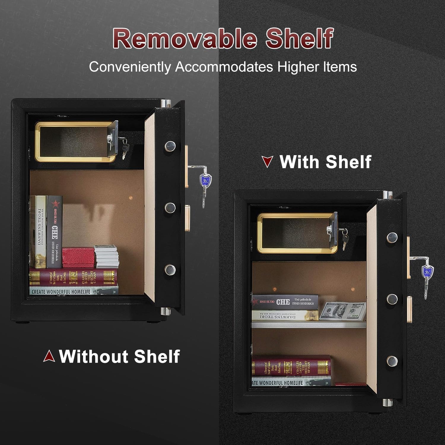 - ✅【REMOVABLE SHELF AND LOCK BOX】: The inside of the safe is covered with leather to prevent valuables from being worn. Removable shelves allow you to move up and down to accommodate the items you want to store. The digital safe has interior box with lock, even you need share your safe with others, you still can have a secure place to load your own valuables such as cash, jewelry, passport, offer another layer of protection.