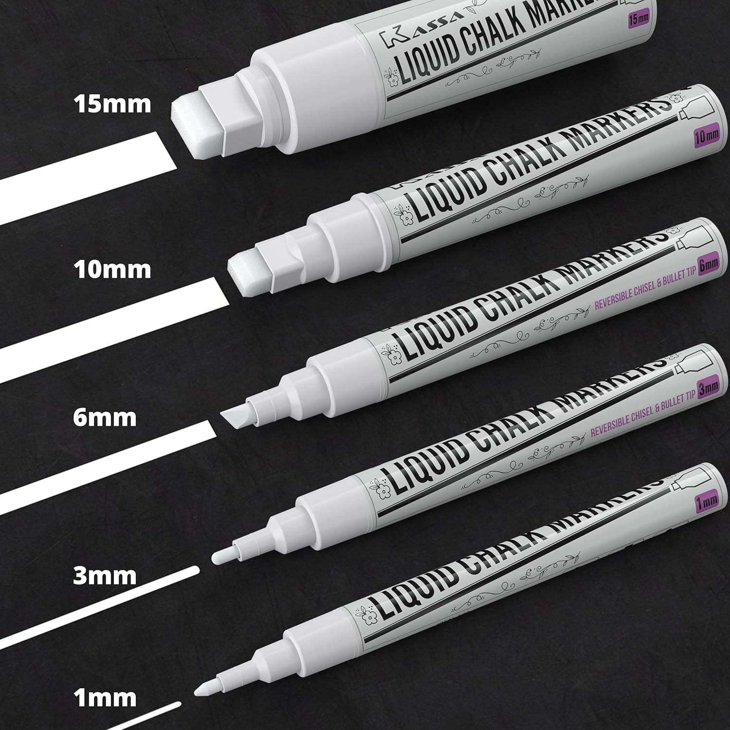 Kassa 5-Pack White Chalk Markers | Includes 1mm, 3mm, 6mm, 10mm & 15mm Tips | Works on Chalkboards, Windows & Glass | Erasable, Dust-Free & Washable | Ideal for Use at Home, School, Office & More