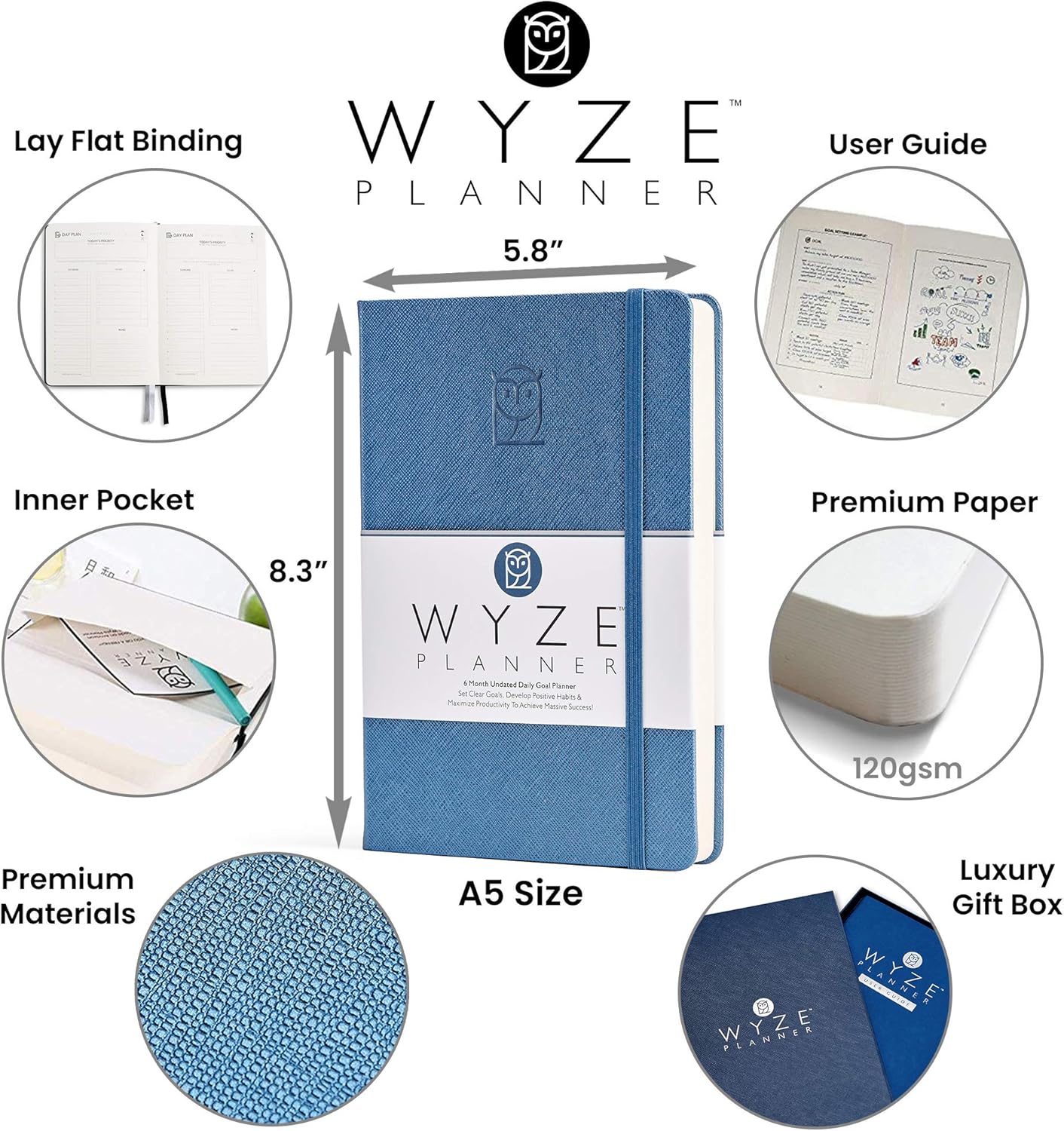 Undated Daily Planner – 6-Month A5 Productivity Organizer with Full Page Per Day, Hourly Schedule, Goal Setting, Habit Tracker, Weekly & Monthly Pages – Hardcover Time Management Notebook (Blue)