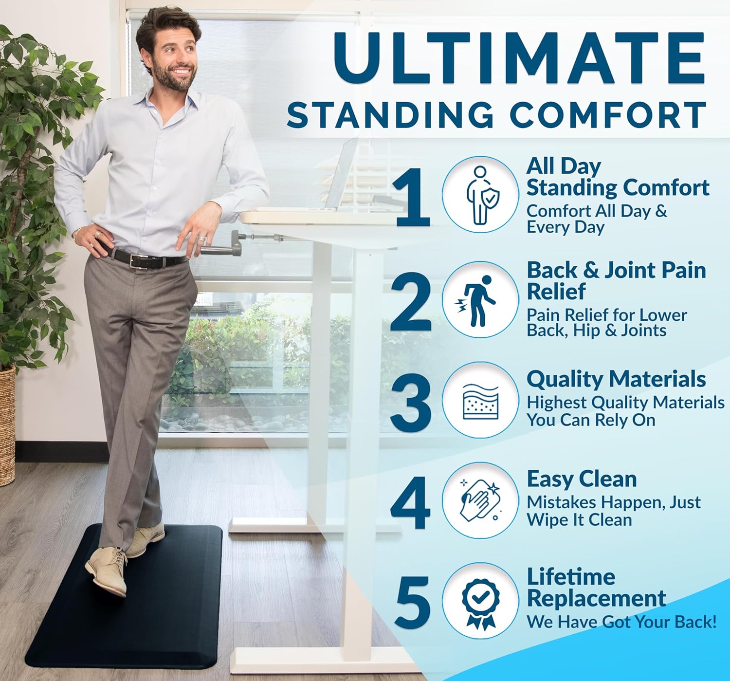 - Multi-use Floor Mat: The ComfiLife standing pad is exceptional for your office while standing at your desk, the kitchen while doing dishes, the laundry room while folding clothes and while working at your workbench. This kitchen rug will add comfort and style to your kitchen and provide lasting comfort and enhanced productivity wherever you stand.
