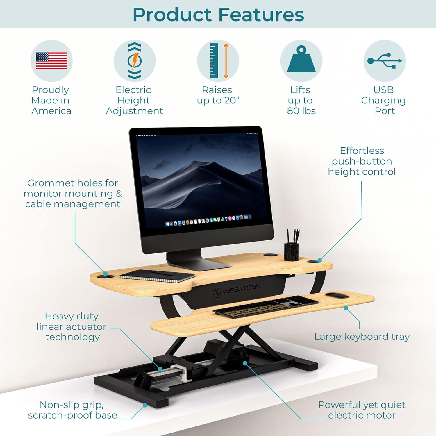 - ✔️ELECTRIC POWERED DESK RISER – VERSADESK desk converter is covered by US Patent No; US 10413055 B2; Holds 80 lbs; Convert your traditional desk and table to a sit to stand desk with VersaDesk standing desk converter; Fast and quiet desk height adjustment; Fully electric power without stopping points; Easily achieve the ergonomic height from 5" to 20” from table surface, ideal for home office, office working station
