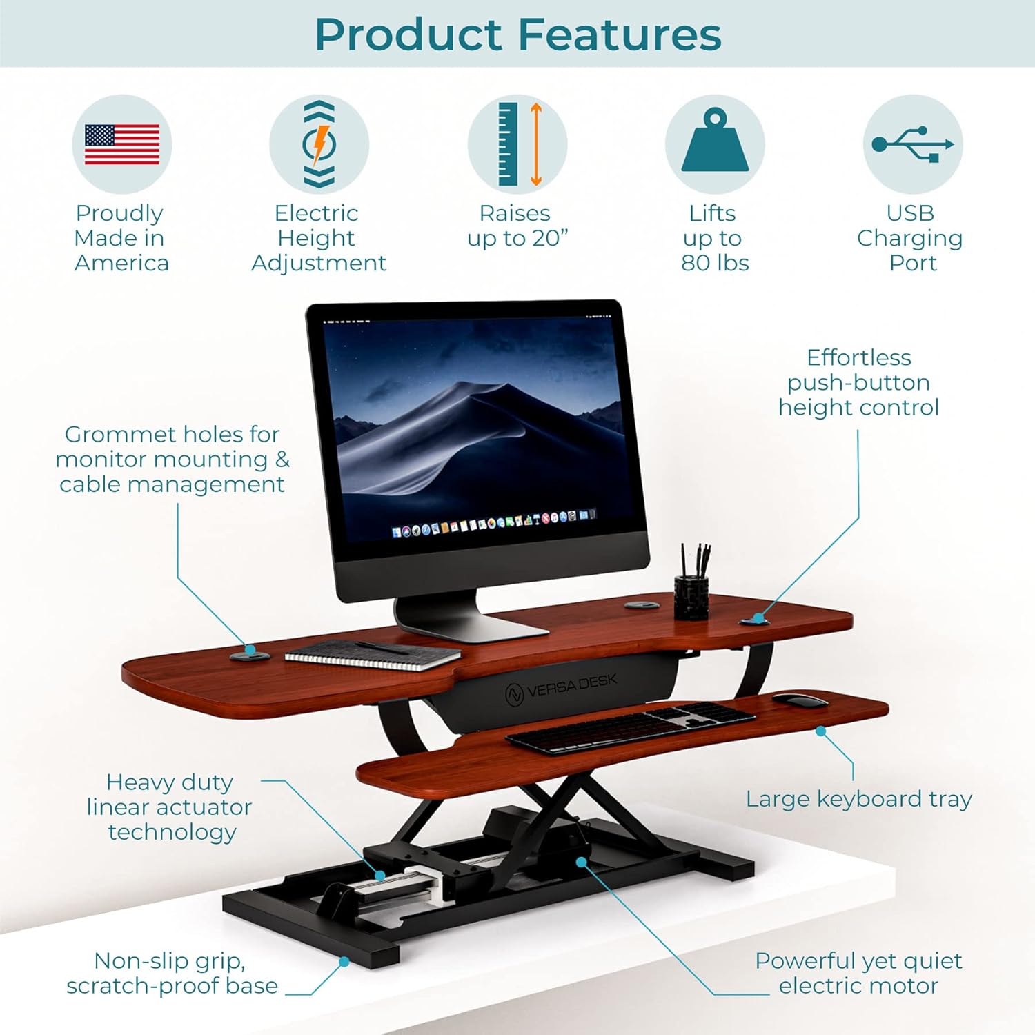 - ELECTRIC STANDING DESK CONVERTER - VERSADESK desk converter is covered by US Patent No; US 10413055 B2; Holds 80 lbs; Converts a traditional computer desk to a sit to stand desk; Felts are attached to the base to protect your desk from scratching; Fast and quiet desk height adjustment; Fully electric power without stopping points; Easily achieve the ergonomic height from 5" to 20” from table surface, ideal for home office, office working station; Monitor and monitor arm not included