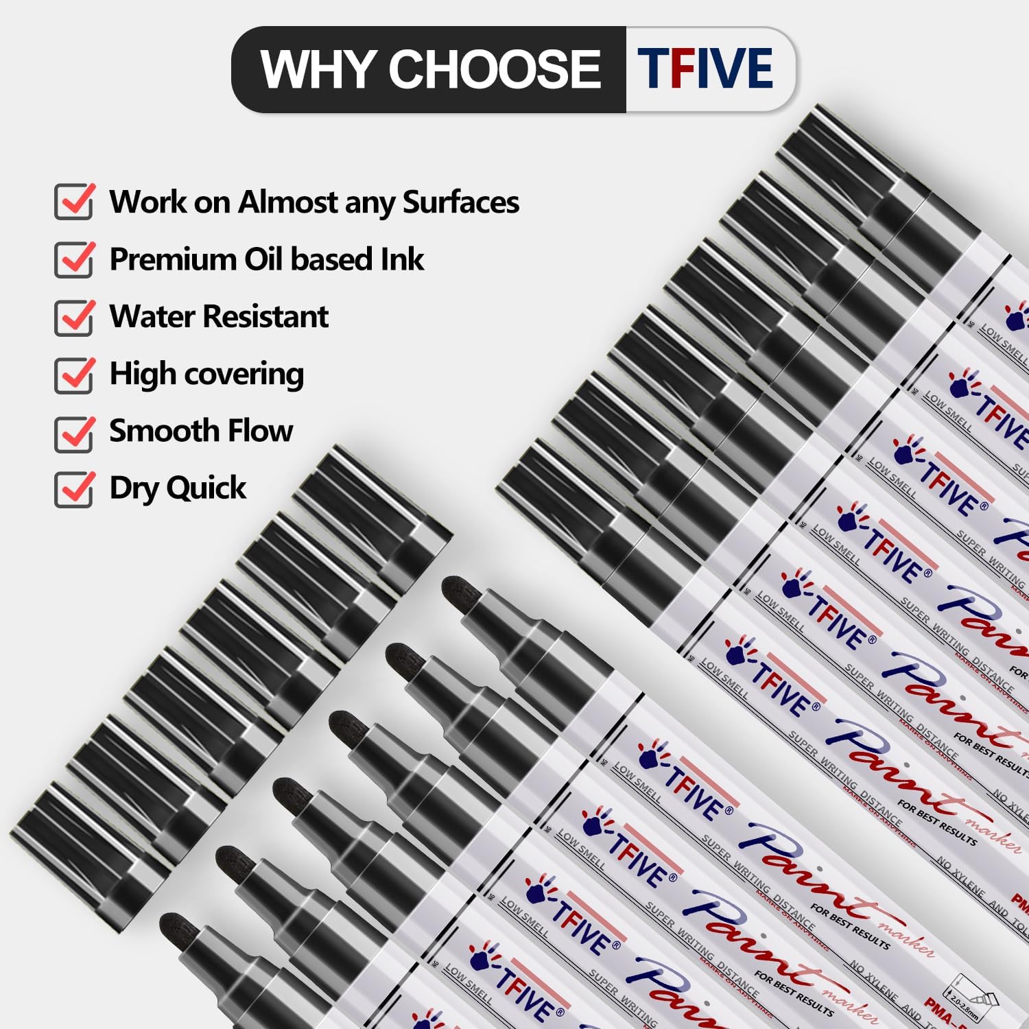- 【VERSATILE】TFIVE black permanent marker paint pen is the best choice to work on a variety of surfaces. Including rock painting ceramic wood leather plastic fabric canvas stone glass metallic wood chalkboard craft supplies etc.