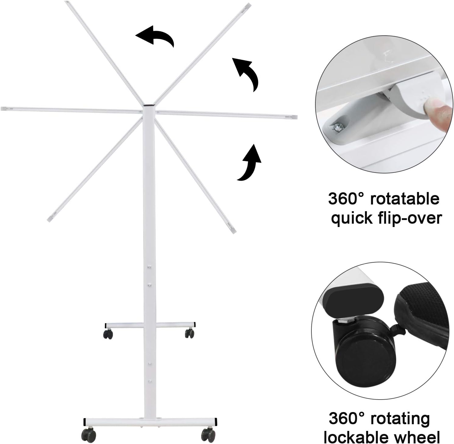 - [Easy Flip Double Sided Magnetic Dry Erase Board & Portable Standing Whiteboard]: Double sided mobile whiteboard have Quick Flip Over Reversible Feature, Flip the board to the other side with the press of a button. You have TWICE the writing space when you utilize BOTH sides of the portable whiteboard with stand, and the 2"(w) x 70.5"(L) pen tray can be placed with a lot of pens and erasers to facilitate your writing anytime and anywhere.