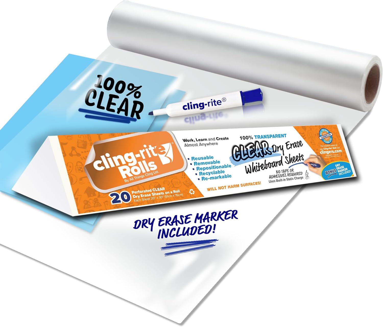 Clingers Clear Dry Erase Cling-rite Rolls - Removable, Recyclable Whiteboard Sheets, 20x30 Inch, 20 Clear Sheets for School, Office Decor, and Art Projects & Dry Erase Marker Included - American Made