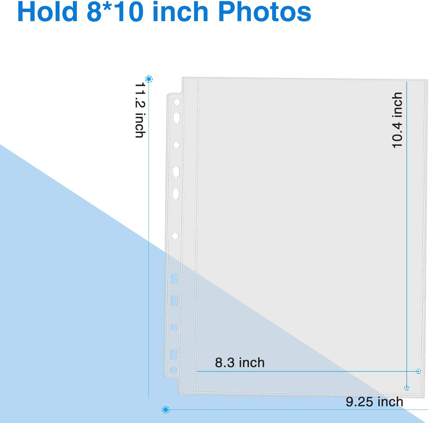 - 30 Pack Photo Sleeves: 11.2 x 9.25" photo album pages with 11-hole punched fit for 3 ring binder and other different kinds of ring binders or albums. The 8.3''x 10.4'' Pockets Perfect for 8''x 10'' or smaller photos or cards, 1 pocket per page, up to 2 photos with 2 inserted back-to-back, totally can hold up to 60 photos or cards.