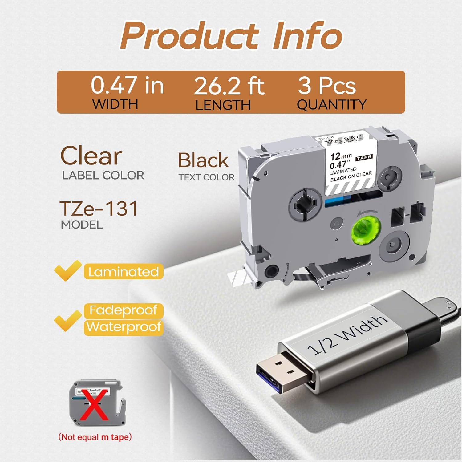 - Package Contain: 3 pack compatible for brother ptouch label tape clear TZe131(TZ-131 TZe 131 TZc-131). Size: 1/2 Inch x 26.2 feet (12 mm x 8 m). Color: black ink on clear. Type: Laminated ptouch label tape clear