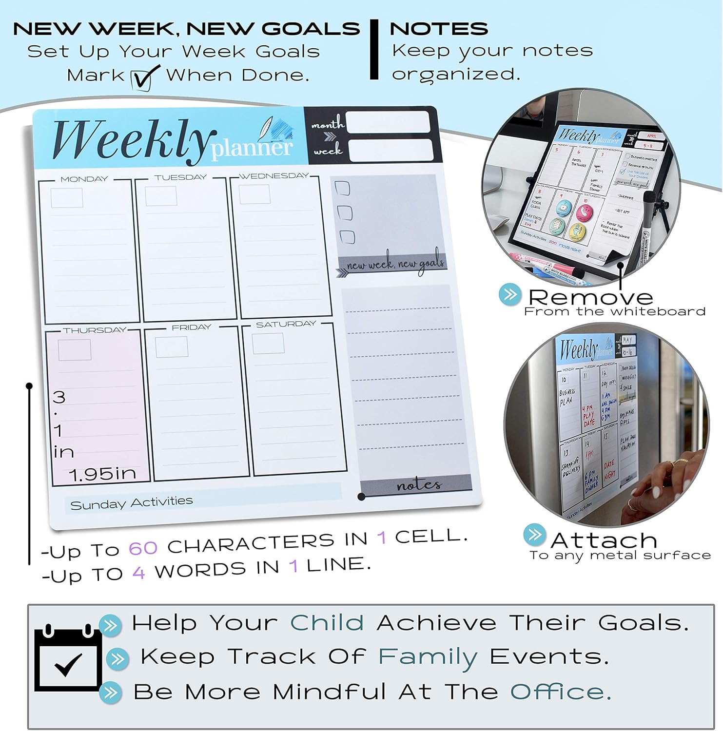 - Get A Versatile Weekly Calendar: Our dry erase magnetic calendar comes with a removable magnetic weekly planner that is perfect for your whiteboard planner, but can also be stuck on the fridge or any magnetic surface.
