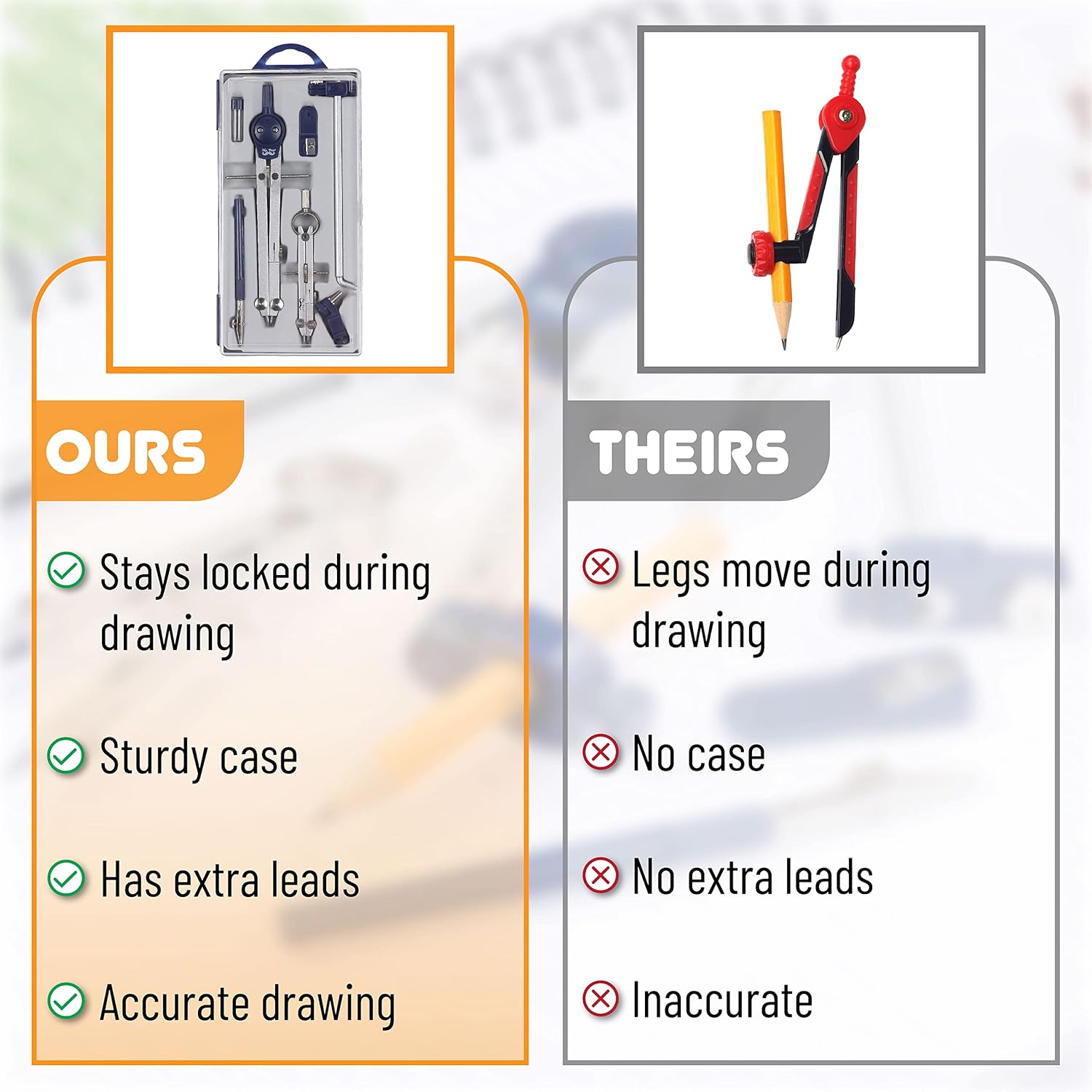 - Precision geometry compass with spring bowhead and center wheel prevents unintentional leg movements