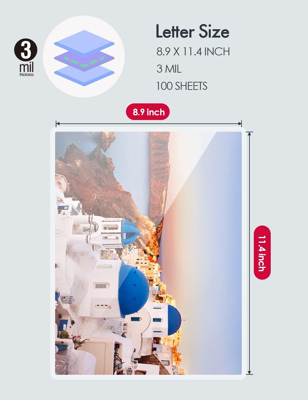 - 【Specifications】Fits Letter size documents, 8.5 x 11 in (229mm x 292mm), pack of 100 Laminator sheets, 3Mil thickness;