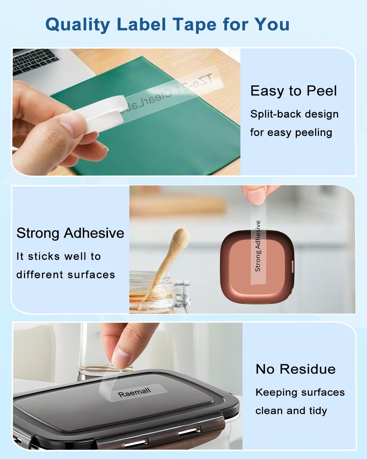 - Easy to Apply: P touch clear label tape split backing makes the clear labels easy to peel and apply; TZe-131 Label maker tape black on clear won't leave residue behind when peeled off most surfaces. Won't smudge or smear