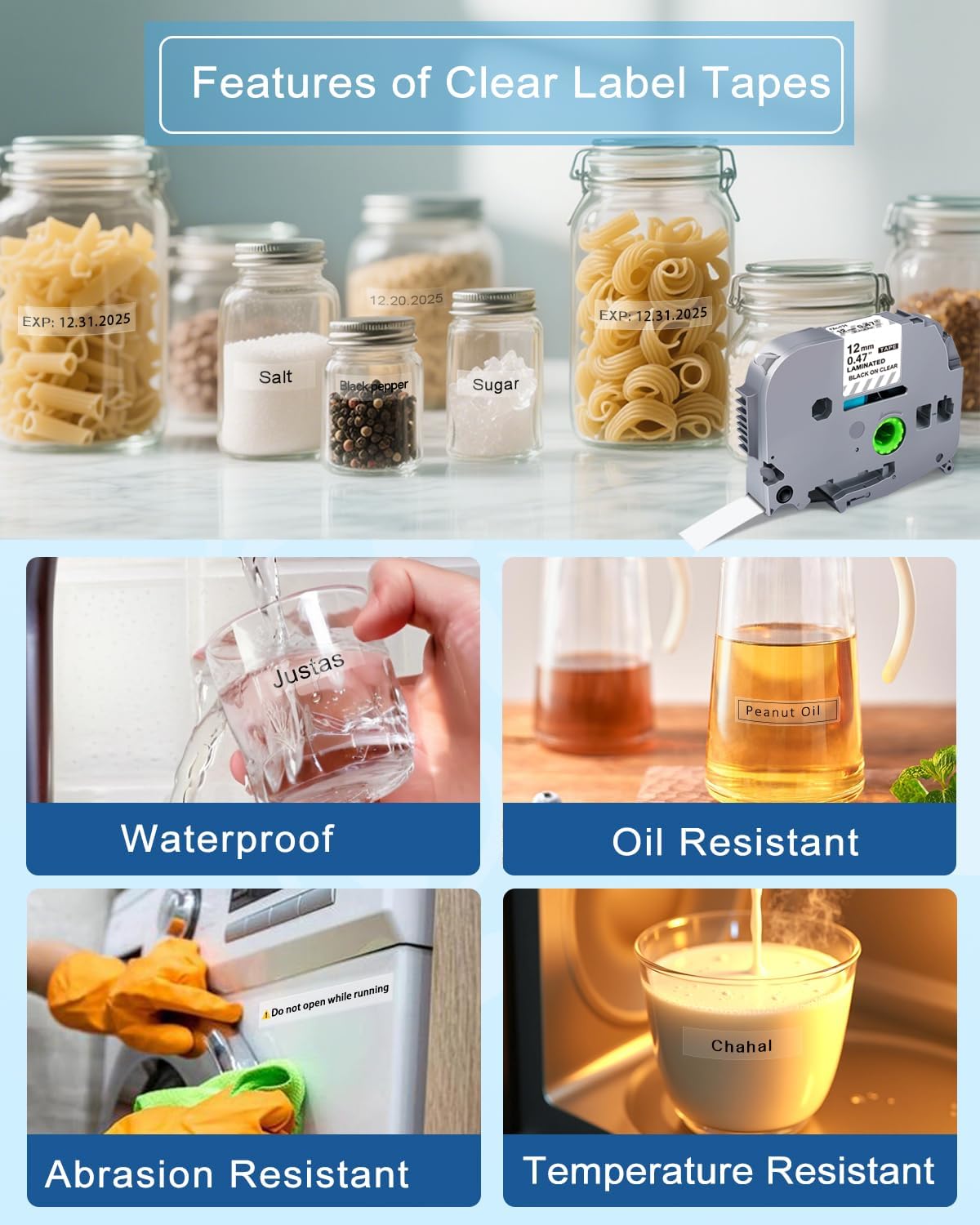 - Label Maker Tape Compatible with brother 12mm .47 laminated clear tz tape water resistant, abrasion resistant, temperature resistant, fade resistant; Replace for Brother clear label tape can be use for outdoors, and they work equally well indoors