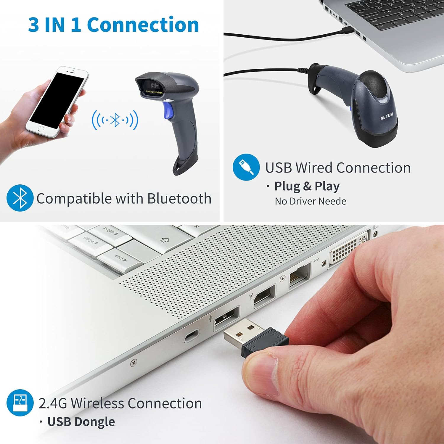 - 【3-in-1 Connection】NETUM M8 Bluetooth barcode scanner can work via Bluetooth + 2.4Ghz wireless + USB 2.0 wired.Supports PC with Windows and Mac OS, Smartphone with IOS and Android, works with Word, Excel, Novell; and almost all common software. It can be widely used in supermarkets, shopping malls, cosmetic stores, retail industry, postal industry, logistics, banks and medical institution