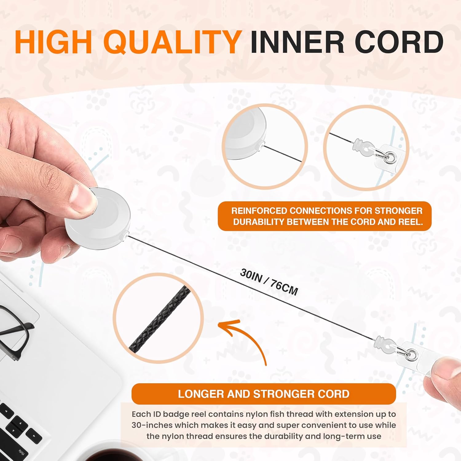 - 【TOP QUALITY BADGE REEL】: Our retractable badge clip is made of high-quality ABS shell and high-strength nylon fish thread of badge clip with 30-inch extension makes retractable badge reel easier to use your ID card. The spring at the joint of id retractable badge holder can reduce the tension and effectively prevents the cord from breaking. All above advantages make it durable