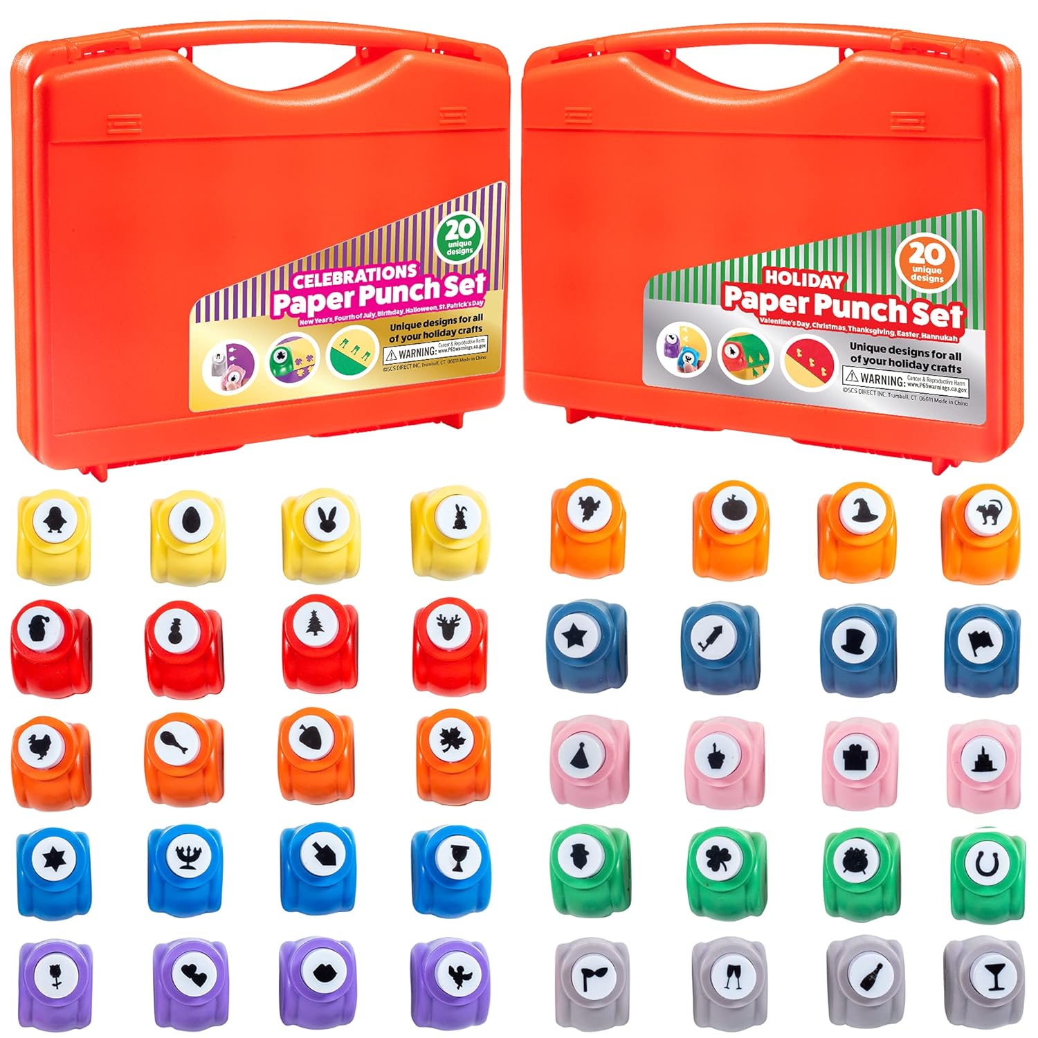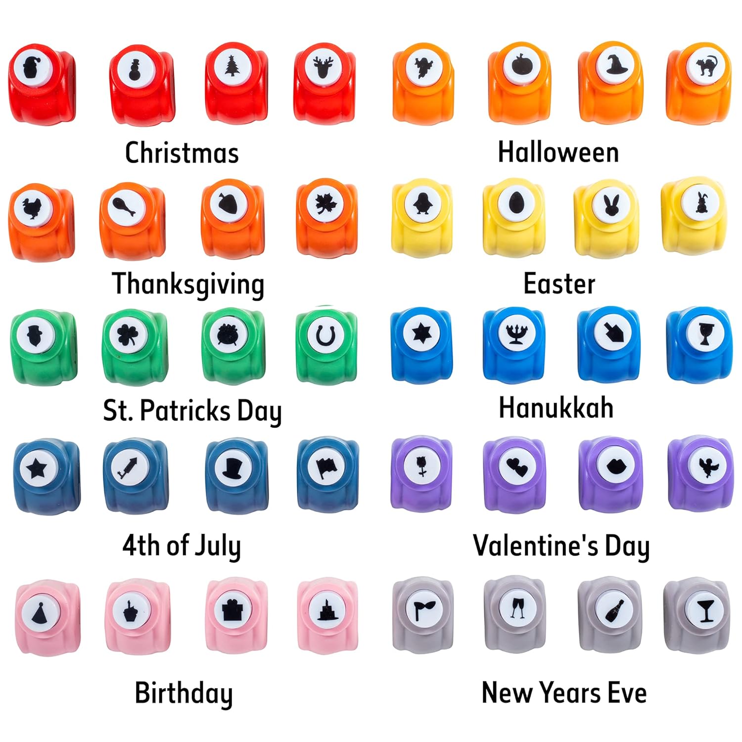 - Mini Scrapbook Paper Hole Puncher 40 pc holiday set featuring Christmas, Hanukkah, Easter, Thanksgiving, Valentine's Day, New Years, Fourth of July, Birthday, Halloween, and St. Patrick's Day!