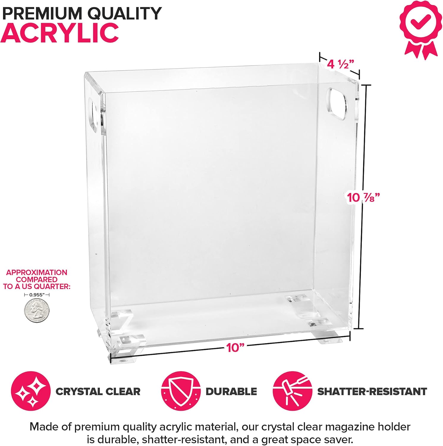 - Premium Quality Acrylic: Our acrylic magazine holder makes storing and displaying your magazines a breeze! Made of premium quality acrylic material, our crystal clear magazine holder is durable, shatter-resistant, and a great space saver. With a modern and stylish look, our magazine holder effortlessly blends in with any home or office decor. Our magazine holder measures approximately 10 Length x 4 Β½β W x 10 β β Height.
